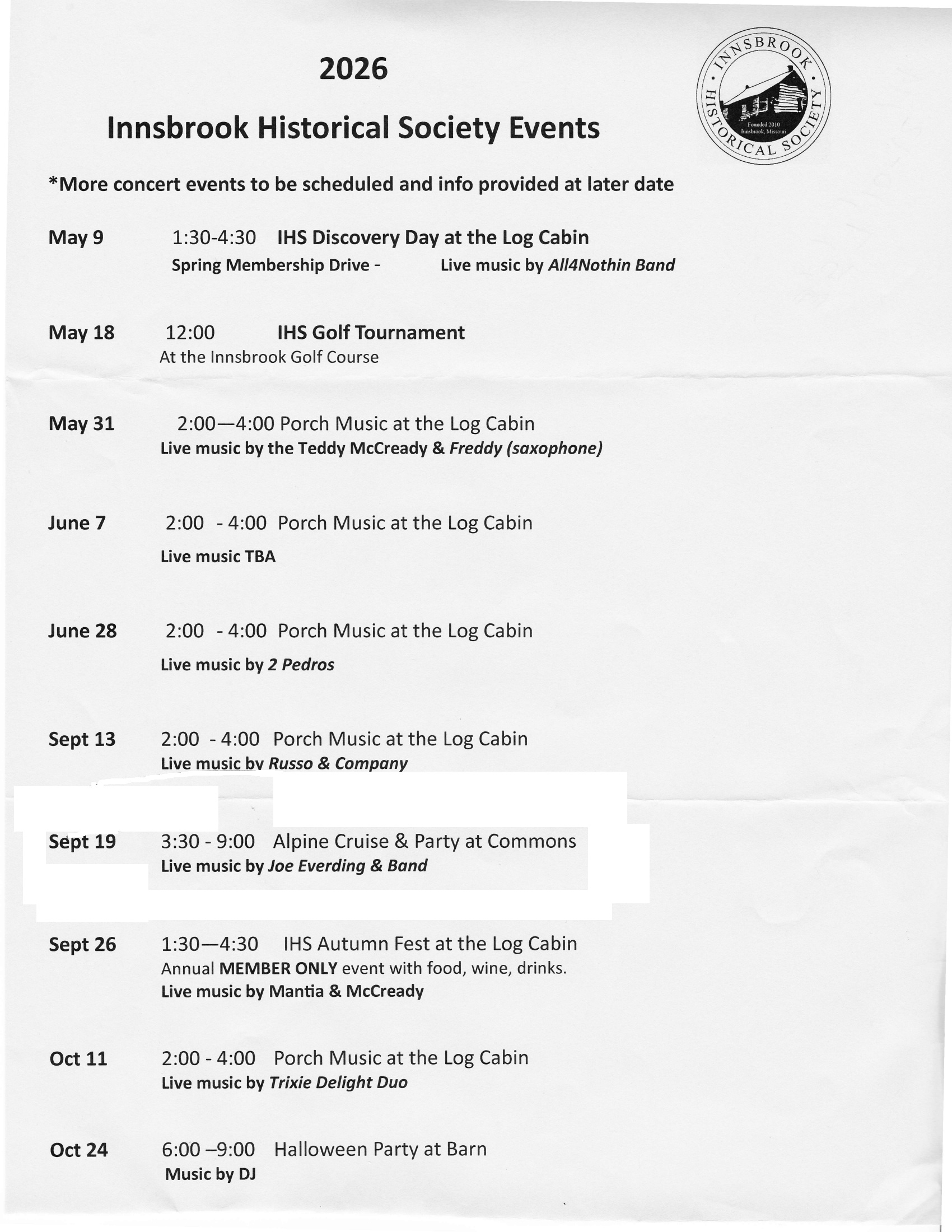 Innsbrook Historical 2026 Events Schedule